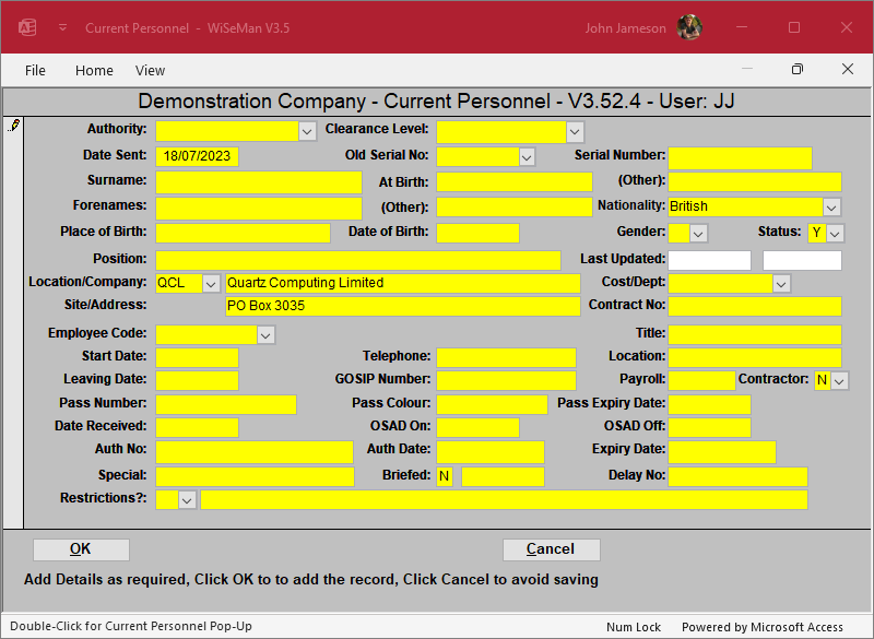 If the Add option is selected, the system will check user permissions and, if there is adequate permission, will display all fields available for modification in yellow, e.g.