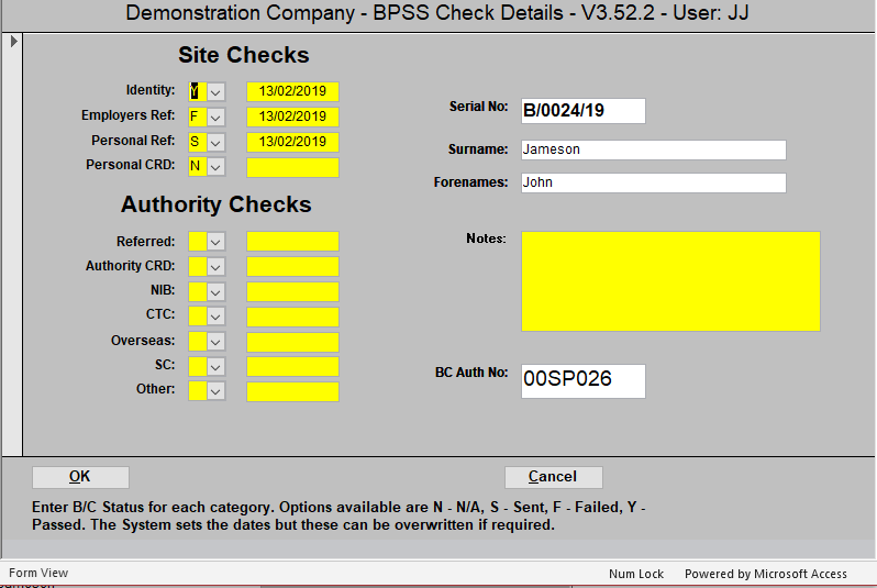 Whilst on the BPSS screen, click on Authorise to enter or generate the B/C Authorisation Number for individuals that have passed the Basic Check. Only available in Application Forms.