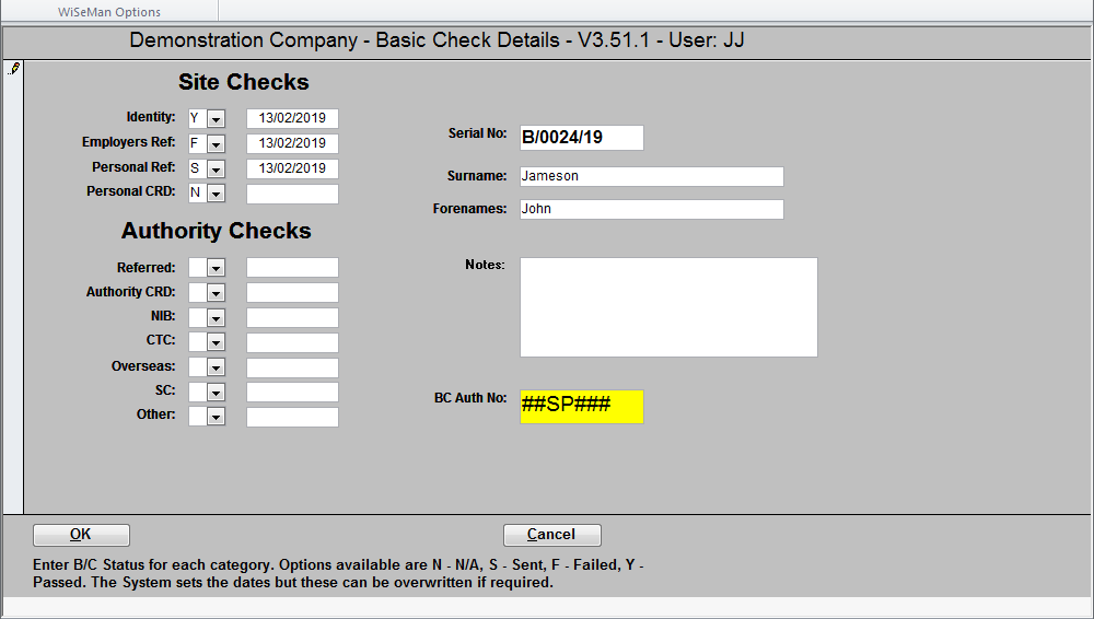If you enter a status of Y - Check Passed, F - Check Failed, S - Sent for more information then the associated date field is set to today's date automatically.