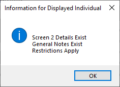 This option will open a small window giving summary information for the individual being displayed. This information includes whether there is Screen 2 information, Basic Check information and a Basic Check Authorisation Number.